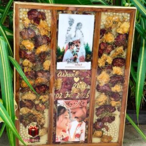 Varmala preservation is the process of preserving a wedding garland (varmala) by carefully drying and sealing it inside a custom frame or resin artwork. It helps couples turn their wedding varmala into a long-lasting memory and a beautiful customized wedding gift.