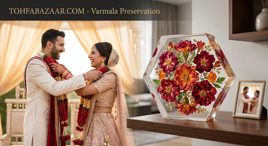 At Tohfa Bazaar, we help couples preserve their wedding memories by transforming their wedding varmala into resin works of art, framed pieces, and decorative exhibits that last forever.