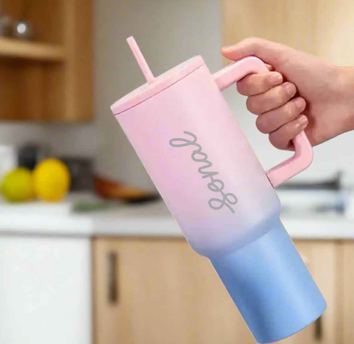 This stylish travel tumbler blends beauty with everyday practicality. Designed with a soft yellow-to-pink gradient, it offers a refreshing and youthful aesthetic that instantly stands out. The sleek personalization — featuring the name adds a special, thoughtful touch, making it ideal for personal use or as a heartfelt gift.