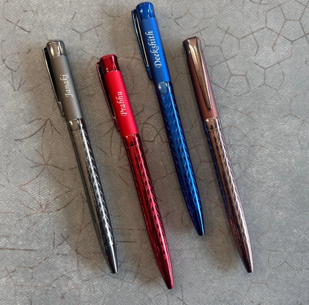 • Laser-Engraved Names : Each pen is customized with precision engraving— and Name on the brown pen—giving them a personal touch that makes every piece truly unique.