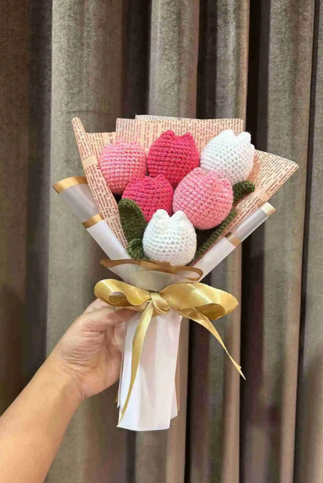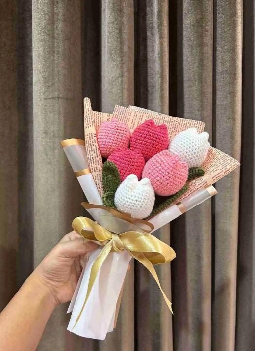 Perfect for weddings, anniversaries, or heartfelt gifting, this Handmade Pink Tulip Bouquet blends craftsmanship and charm. Inspired by popular crochet pink tulip patterns, each bloom is carefully created with premium yarn to ensure long-lasting beauty without the worry of wilting.