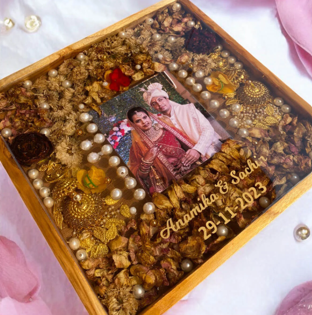 Preserve the best memories of your wedding day with this beautifully crafted 12×12 inch Teakwood Frame. Designed to showcase your wedding varmala flowers, this frame preserves their beauty in crystal-clear resin, capturing their vibrant colors and intricate details for years to come. This personalized wedding keepsake serves not only as a stunning piece of art but also as a meaningful way to commemorate one of the most important days of your life.