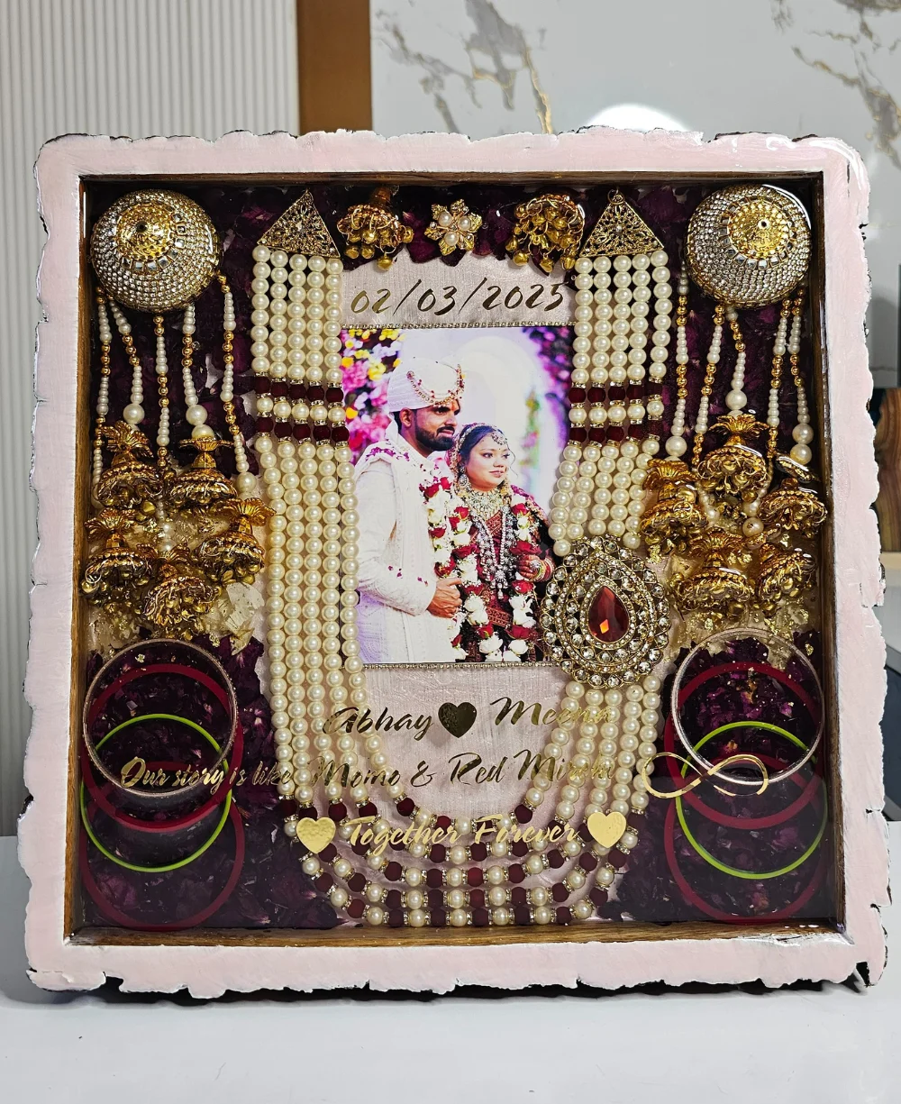 Capture the magic of your wedding day with this beautifully crafted Personalized Square Wooden Resin Art. This unique keepsake features your wedding photo at the center, surrounded by preserved varmala flowers that symbolize the love and joy of your special day. Custom-designed with your wedding photo and names, it’s a truly one-of-a-kind memento that reflects the essence of your wedding celebration.