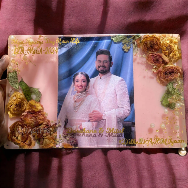 Capture the magic of your wedding day with this beautifully crafted Personalized Rectangular Resin Art. This unique keepsake features your wedding photo at the center, surrounded by preserved varmala flowers that symbolize the love and joy of your special day. Custom-designed with your wedding photo and names, this piece becomes a truly one-of-a-kind memento that reflects the essence of your wedding celebration.