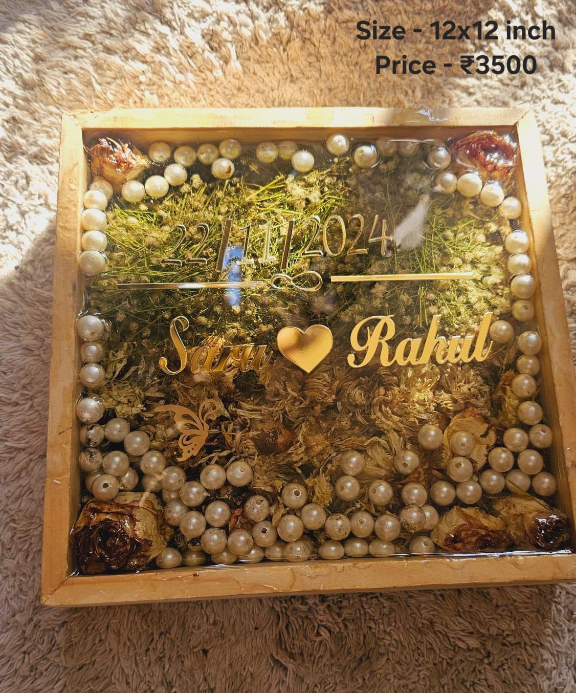 Capture the beauty and significance of your wedding day with this personalized resin varmala preservation photo frame. This custom-made keepsake elegantly combines your cherished photo, names, and wedding date within a beautiful 12-inch teak wood frame, all preserved in crystal-clear resin. Add a meaningful touch by including your wedding varmala flowers, transforming them from a traditional garland into a treasured memory that lasts forever. Instead of discarding your wedding mala or garlands, this frame allows you to immortalize them as part of a timeless decor piece.